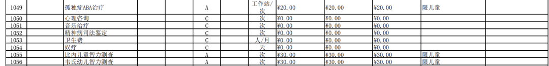 除了在康復(fù)項(xiàng)目中有孤獨(dú)癥兒童語言障礙訓(xùn)練和ADI量表測(cè)評(píng)外,在精神科的診療項(xiàng)目中,還將ABA治療納入了A類項(xiàng)目。