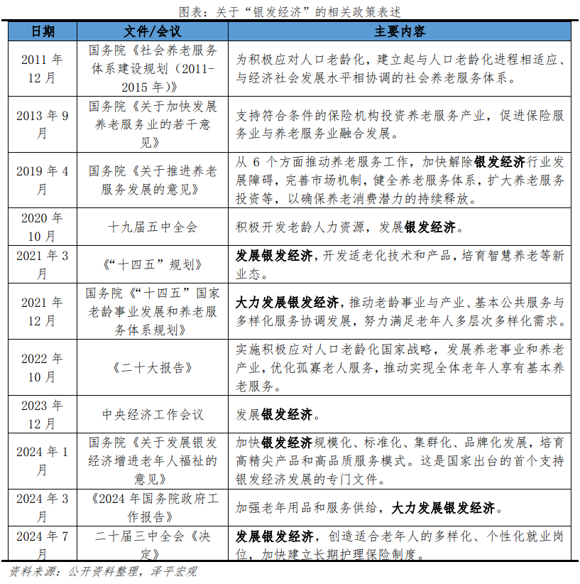 銀發(fā)經(jīng)濟是向老年人提供產(chǎn)品和服務(wù),以及為老齡階段做準備等一系列經(jīng)濟活動的總和,既包括“為老”、也包括“備老”。“銀發(fā)經(jīng)濟”的概念起源于日本,后來歐美和其他亞洲國家陸續(xù)提出。我國在2019年提出“銀發(fā)經(jīng)濟”概念,2020年提出“發(fā)展銀發(fā)經(jīng)濟”,2024年1月國務(wù)院印發(fā)《關(guān)于發(fā)展銀發(fā)經(jīng)濟增進老年人福祉的意見》,是首個以“銀發(fā)經(jīng)濟”命名的政策文件,對銀發(fā)經(jīng)濟做出明確定義:向老年人提供產(chǎn)品或服務(wù),以及為老齡階段做準備等一系列經(jīng)濟活動的總和。