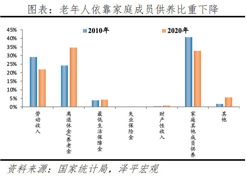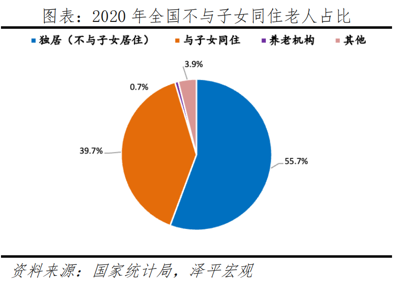 3)居住獨立、經(jīng)濟獨立,空巢老人占比超5成,2010-2020年依靠家庭供養(yǎng)比例從40.7%降至32.7%。隨著傳統(tǒng)觀念轉(zhuǎn)變,疊加家庭規(guī)模不斷縮小、子女數(shù)量下降、人口流動加快,老年人更多選擇不與成年子女同住。根據(jù)七普數(shù)據(jù),全國有39.7%的老年人與子女同住,55.7%的老年人只與配偶同住或者獨居。分城鄉(xiāng)看,城市、鎮(zhèn)、鄉(xiāng)村獨居老人占比分別為52.2%、53%、59.4%,由于農(nóng)村大量年輕勞動力外出務(wù)工或定居更發(fā)達地區(qū),更多老年人獨居在家。此外,隨著社會保障體系逐漸完善,更多老年人依靠離退休金生活,經(jīng)濟條件更加獨立。根據(jù)人口普查數(shù)據(jù),2010-2020年,60歲及以上人口中,依靠離退休金/養(yǎng)老金的占比從24.1%增至34.7%,依靠家庭其他成員供養(yǎng)的占比從40.7%降至32.7%。