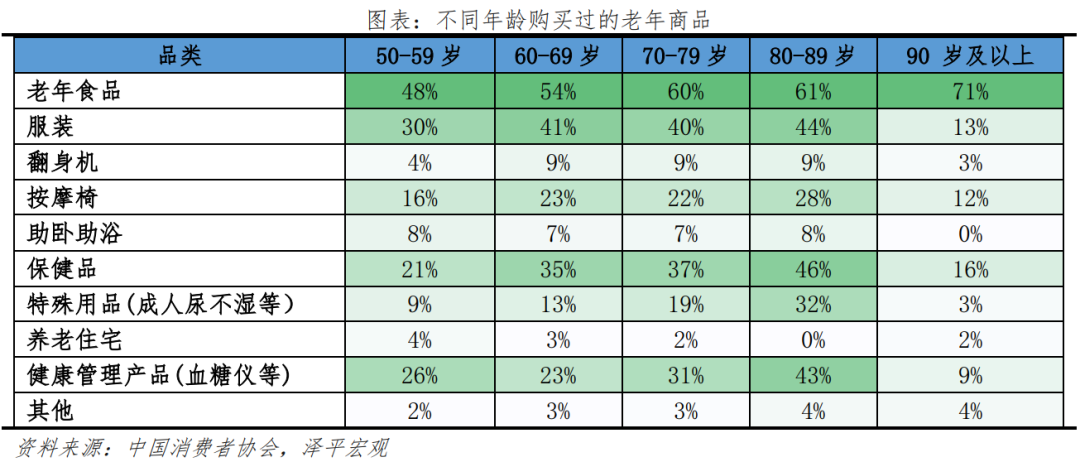 2)分年齡看,低齡老人需要消費、社交、娛樂,高齡老人需要照護服務(wù),長壽老人關(guān)注身體機能變化等方面。傳統(tǒng)老年人口劃分為60歲及以上或65歲及以上人口,如果考慮備老人群,可把銀發(fā)群體擴展到50歲及以上人群。按年齡劃分,銀發(fā)群體可分為準老人(50-64歲)、低齡老人(65-74歲)、高齡老人(75-89歲)、長壽老人(90歲及以上)。年齡階段不同,老年群體的需求也不盡相同,其中準老人處于職業(yè)生涯晚期,身體相對健康,即將退休,重點關(guān)注文娛、抗衰老等方面;低齡老人剛步入退休階段,處于退休適應(yīng)期,重點關(guān)注健康管理、娛樂社交等方面,對短途旅行、老年大學(xué)等方面的需求增加;高齡老人身體機能減退,自理能力減弱,更加關(guān)注醫(yī)療保健、養(yǎng)老服務(wù)等方面;長壽老人更加注重精神層面需求,安享晚年生活。
