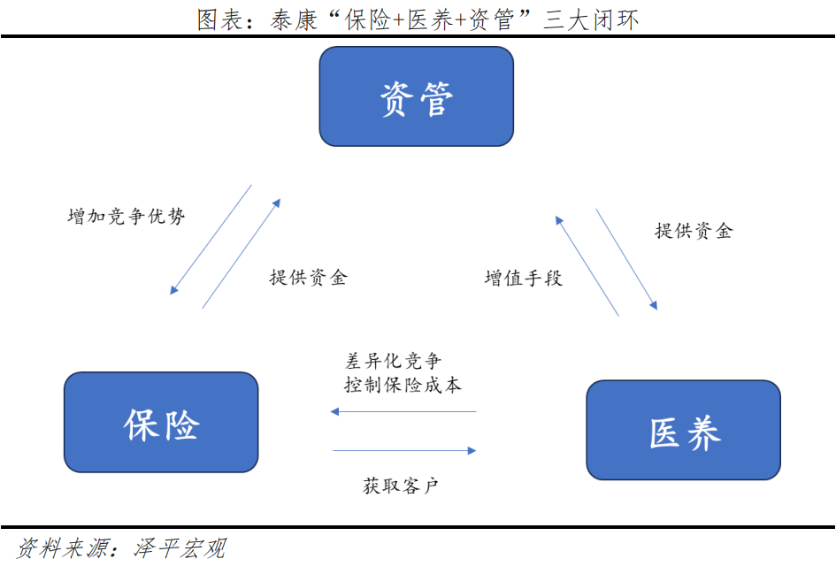 泰康通過跨界醫(yī)養(yǎng)產(chǎn)業(yè)布局,實現(xiàn)虛擬保險產(chǎn)品與實際醫(yī)養(yǎng)服務(wù)結(jié)合,構(gòu)建“保險+醫(yī)養(yǎng)+資管”三大閉環(huán)。泰康之家定位于高端養(yǎng)老服務(wù),致力于打造“都市醫(yī)養(yǎng)社區(qū)”??蛻敉ㄟ^購買泰康指定的養(yǎng)老保險產(chǎn)品,可在泰康的養(yǎng)老體系中享受養(yǎng)老服務(wù);通過購買健康保險產(chǎn)品,可在泰康的醫(yī)療健康體系中獲得醫(yī)療服務(wù);資產(chǎn)管理則為客戶的健康和養(yǎng)老需求儲備物質(zhì)財富。通過閉環(huán)整合,泰康之家有效控制保險成本,提升保險產(chǎn)品的市場競爭力。