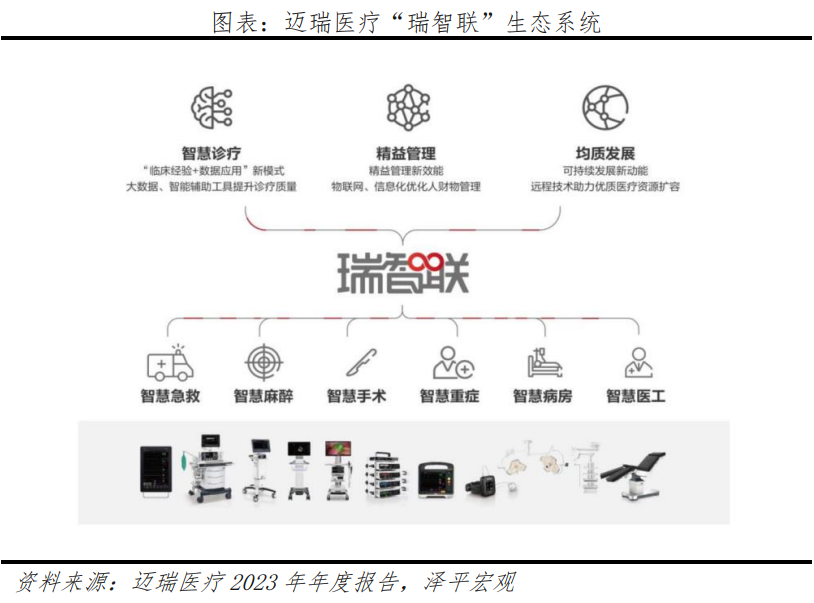 多元發(fā)展構(gòu)筑戰(zhàn)略縱深。1)2024年1月,收購惠泰醫(yī)療,快速進入電生理和血管介入等高值耗材領(lǐng)域。2)基于領(lǐng)先的腔鏡平臺,加速提升耗材市場份額,邁瑞在“設(shè)備+耗材”品類有較強的優(yōu)勢和研發(fā)基因。3)拓展動物醫(yī)療,面向不同動物以及應(yīng)用場景,建立體外診斷、生命信息與支持、醫(yī)學(xué)影像技術(shù)研究平臺。