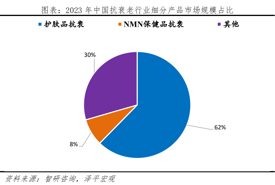 抗衰領(lǐng)域,隨著生活方式和化妝習(xí)慣變化,銀發(fā)族對永葆青春渴望推動抗衰老產(chǎn)品銷售增長,預(yù)計2024年中國抗衰市場規(guī)模達1500億元。2024年1月,國務(wù)院發(fā)布的《關(guān)于發(fā)展銀發(fā)經(jīng)濟增進老年人福祉的意見》中強調(diào):“發(fā)展抗衰老產(chǎn)業(yè),推動生物技術(shù)與延緩老年病深度融合,開發(fā)老年病早期篩查產(chǎn)品和服務(wù)。”當前,消費者對抗衰老護膚品的需求日益多元化,市場消費熱情持續(xù)高漲。根據(jù)智研咨詢數(shù)據(jù),2023年中國抗衰老行業(yè)市場規(guī)模約為1522億元,其中,護膚品抗衰老、NMN保健品抗衰、其他抗衰產(chǎn)品占比分別為62%、30%、8%。隨著抗衰老護膚品和保健品成分的迭代升級,越來越多消費者認可抗衰成分的有效性,并通過使用護膚品和保健品進行抗衰老。根據(jù)艾媒咨詢數(shù)據(jù),目前,68.2%的消費者通過健身進行抗衰老,62.4%的消費者使用護膚品,近五成的消費者注重飲食和服用保健品。