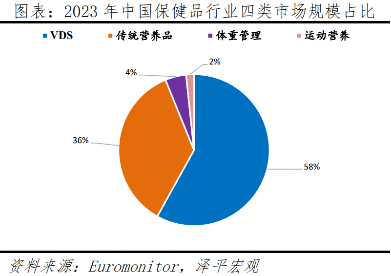 膳食補充劑占保健品市場主導(dǎo)地位,中老年人更偏好鈣片、奶粉、維生素和葉黃素等產(chǎn)品。保健品市場主要分為維生素和膳食補充劑(VDS)、運動營養(yǎng)品、體重管理和傳統(tǒng)滋補四大類。根據(jù)Euromonitor數(shù)據(jù),2023 年VDS 市場規(guī)模占中國保健品行業(yè)近60%,消費者主要出于日常增強免疫力的需求選擇VDS產(chǎn)品。其中,鈣片、奶粉、魚油、維生素、葉黃素等品類尤其受到中老年人的歡迎。例如,隨著年齡增長,老年人對營養(yǎng)的需求變化,專為老年人設(shè)計的高鈣奶粉、富含多種維生素和礦物質(zhì)的營養(yǎng)麥片、深海魚油等保健食品,有助于補充所需營養(yǎng),維持身體健康。對于患有慢性疾病或身體虛弱的老年人,膳食補充劑如維生素D、益生菌等,可以幫助他們更好地攝取營養(yǎng),增強免疫力。從市占率看,根據(jù)Euromonitor數(shù)據(jù),2023年湯臣倍健在VDS市場的市占率為10.4%,穩(wěn)居行業(yè)龍頭,其次是安利與健合集團,前十企業(yè)市場集中度低于40%,我國保健品市場仍具有較大的整合和發(fā)展空間。(膳食補充劑是含有維生素、礦物質(zhì)、草藥或其它植物產(chǎn)品或氨基酸的產(chǎn)品(除煙草之外)。)