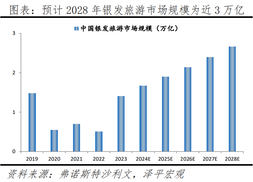 展望未來,隨著60、70后“黃金一代”逐漸步入老齡化,中高端旅游產(chǎn)品將迎來更多發(fā)展機遇,旅游服務(wù)重要性愈發(fā)凸顯,預(yù)計2028年,銀發(fā)旅游市場規(guī)模將達約2.7萬億元,2024-2028年年均復(fù)合增速將達12.4%。