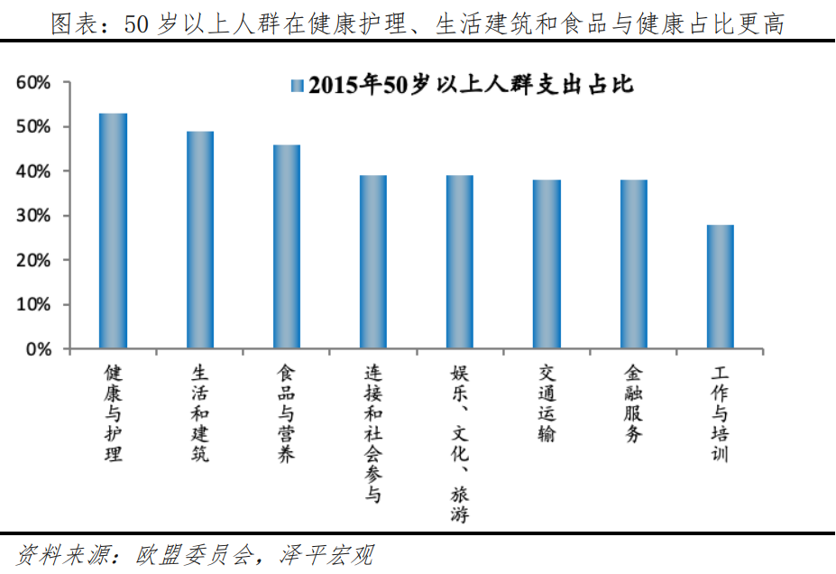 歐洲銀發(fā)經(jīng)濟發(fā)展主要集中于以下三個方面:1)基本功能性產(chǎn)品。為老年人營造友好環(huán)境,將無障礙設(shè)施以及老年人所需要的產(chǎn)品和服務(wù)納入主流市場。比如醫(yī)療健康、綜合護理服務(wù)等。2)生活方式相關(guān)產(chǎn)品。在工作、生活、住房、休閑、旅行、交通等方面,滿足不同老年群體需求。比如老年友好型大學(xué)、適老化住房、功能性食品、個性化營養(yǎng)方案、銀發(fā)旅游等。3)升級附加類產(chǎn)品。進行科技化、智能化升級,進而拉動新興市場。比如智能家居、健康管理、安全監(jiān)護、遠程護理、服務(wù)機器人等。根據(jù)歐盟委員會《銀發(fā)經(jīng)濟》報告,2015年50歲以上人群支出占比前三名的行業(yè)是健康護理、生活建筑和食品與健康,分別為53%、49%、46%。