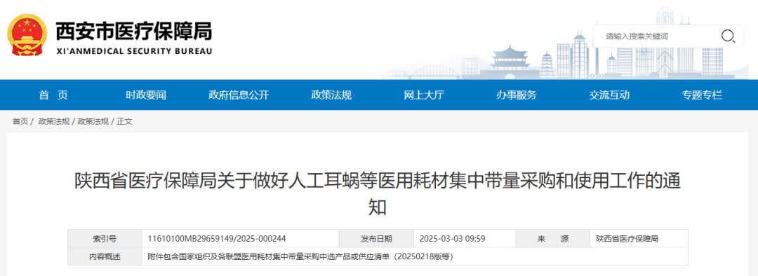 3月3日,陜西省醫(yī)療保障局發(fā)布《關(guān)于做好人工耳蝸等醫(yī)用耗材集中帶量采購和使用工作的通知》,其中指出,自2025年3月31日起執(zhí)行人工耳蝸、乳房旋切針、血管組織閉合用結(jié)扎夾、導(dǎo)引導(dǎo)管和導(dǎo)引導(dǎo)絲、預(yù)充式導(dǎo)管沖洗器等醫(yī)用耗材集中帶量采購中選結(jié)果;自2025年5月1日起執(zhí)行外周血管支架集采中選結(jié)果。其中人工耳蝸、外周血管支架、乳房旋切針采購周期3年,血管組織閉合用結(jié)扎來、導(dǎo)引導(dǎo)管和導(dǎo)引導(dǎo)絲接續(xù)采購周期2年,預(yù)充式導(dǎo)管沖洗器采購周期1年。