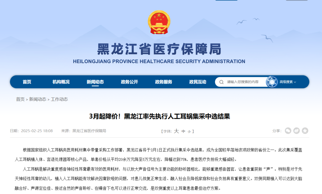 根據(jù)國家組織人工耳蝸類醫(yī)用耗材集中帶量采購工作部署,黑龍江省于3月1日正式執(zhí)行集采中選結(jié)果,成為全國較早落地該項(xiàng)政策的省份之一。此次集采覆蓋人工耳蝸植入體、言語處理器等核心產(chǎn)品,單套價格從平均20余萬元降至5萬元左右,降幅達(dá)到75%,患者醫(yī)療負(fù)擔(dān)將大幅減輕。
