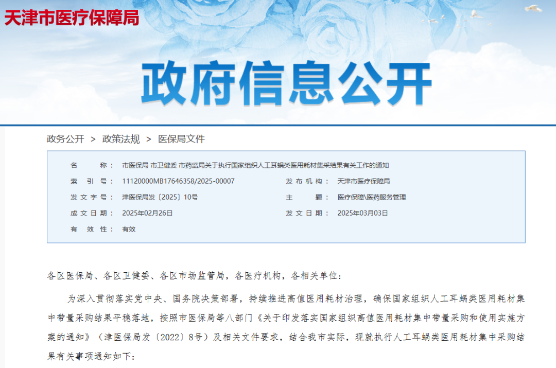 3月3日,天津市醫(yī)保局聯(lián)合有關(guān)部門發(fā)布了《關(guān)于執(zhí)行國家組織人工耳蝸類醫(yī)用耗材集采結(jié)果有關(guān)工作的通知》,自3月1日起,天津市相關(guān)患者可以使用上集采降價后的人工耳蝸中選產(chǎn)品,標(biāo)志著國家集采人工耳蝸中選結(jié)果在津正式落地。