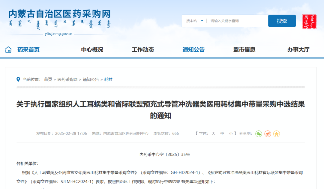 2月28日,福建醫(yī)保局發(fā)布《關(guān)于落實(shí)國家組織人工耳蝸類及外周血管支架類醫(yī)用耗材集中帶量采購有關(guān)工作的通知》,其中指出,人工耳蝸類中選結(jié)果于2025年3月7日在福建省醫(yī)療保障信息平臺藥品和醫(yī)用耗材招標(biāo)和采購交易子系統(tǒng)掛網(wǎng),3月11日起正式執(zhí)行;外周血管支架類中選結(jié)果于5月12日在招采子系統(tǒng)掛網(wǎng),5月14日起正式執(zhí)行。
