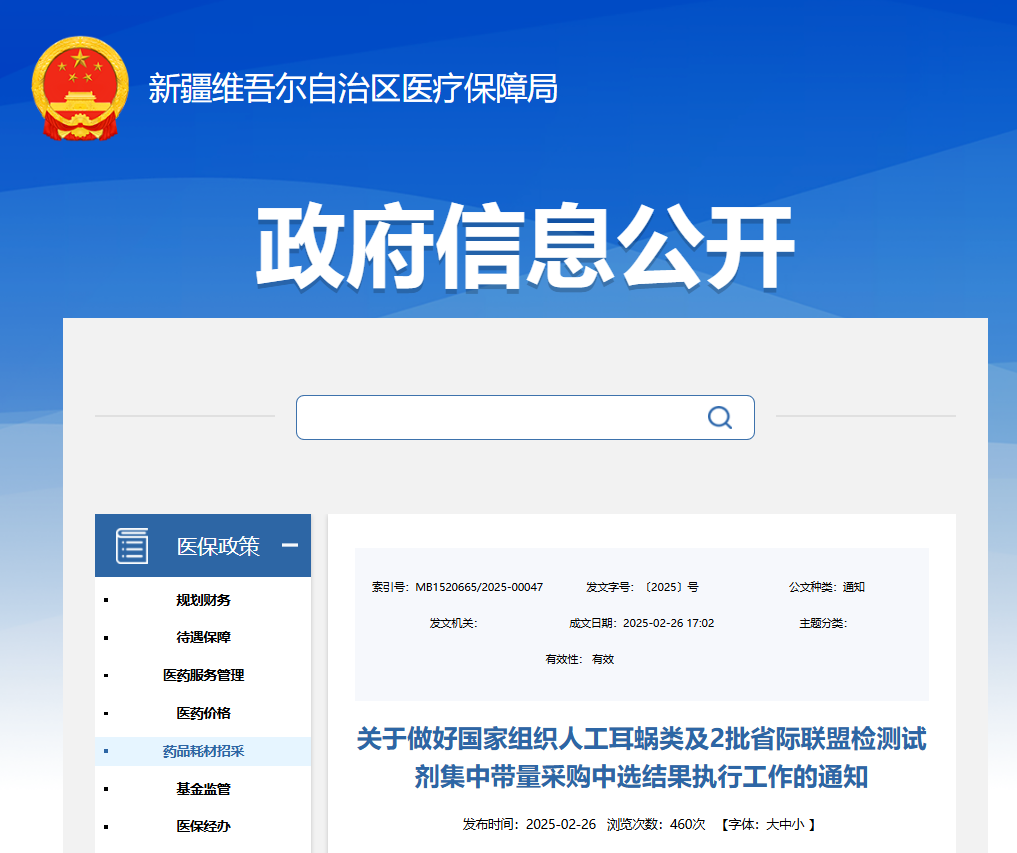 3月3日,新疆維吾爾自治區(qū)醫(yī)療保障局發(fā)布通知,明確自2025年3月1日起正式執(zhí)行人工耳蝸集中帶量采購中選結(jié)果,并于3月15日同步落地安徽2023年體外診斷試劑、江西腎功和心肌酶生化類檢驗(yàn)試劑集采成果。
