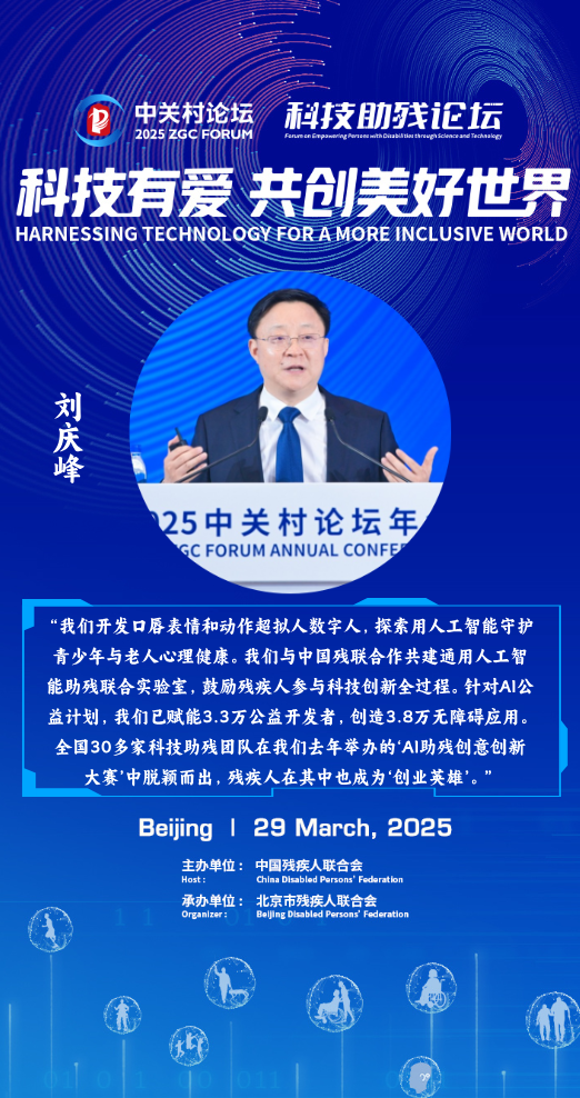 3月29日,由中國殘聯(lián)主辦、北京市殘聯(lián)承辦的2025中關(guān)村論壇年會(huì)科技助殘平行論壇在北京舉行。中國殘聯(lián)主席程凱出席論壇,中國殘聯(lián)黨組書記、理事長(zhǎng)周長(zhǎng)奎,北京市副市長(zhǎng)馬駿,科技部五司司長(zhǎng)鄭健出席論壇開幕式并致辭。