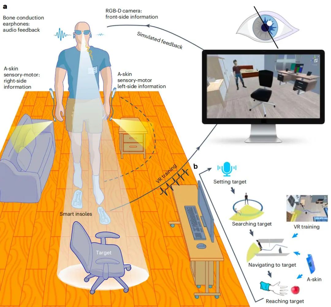 近日,上海交通大學顧磊磊副教授團隊聯(lián)合復旦大學、香港科技大學、華東師范大學等研發(fā)了一款融合AI和柔性電子的多模態(tài)可穿戴助盲系統(tǒng)。該系統(tǒng)整合視覺、聽覺和觸覺,以AI算法驅(qū)動進行環(huán)境監(jiān)測,在穿戴者接近障礙物或物體時會通過骨傳導耳機進行語音提示,向其發(fā)送信號。而貼在手腕的可伸展柔性電子皮膚則能有效探測障礙物,并進行震動提醒,以此提升佩戴者的周邊環(huán)境感知能力,從而實現(xiàn)移動、抓取等視覺任務(wù),能有效輔助視障人群出行。