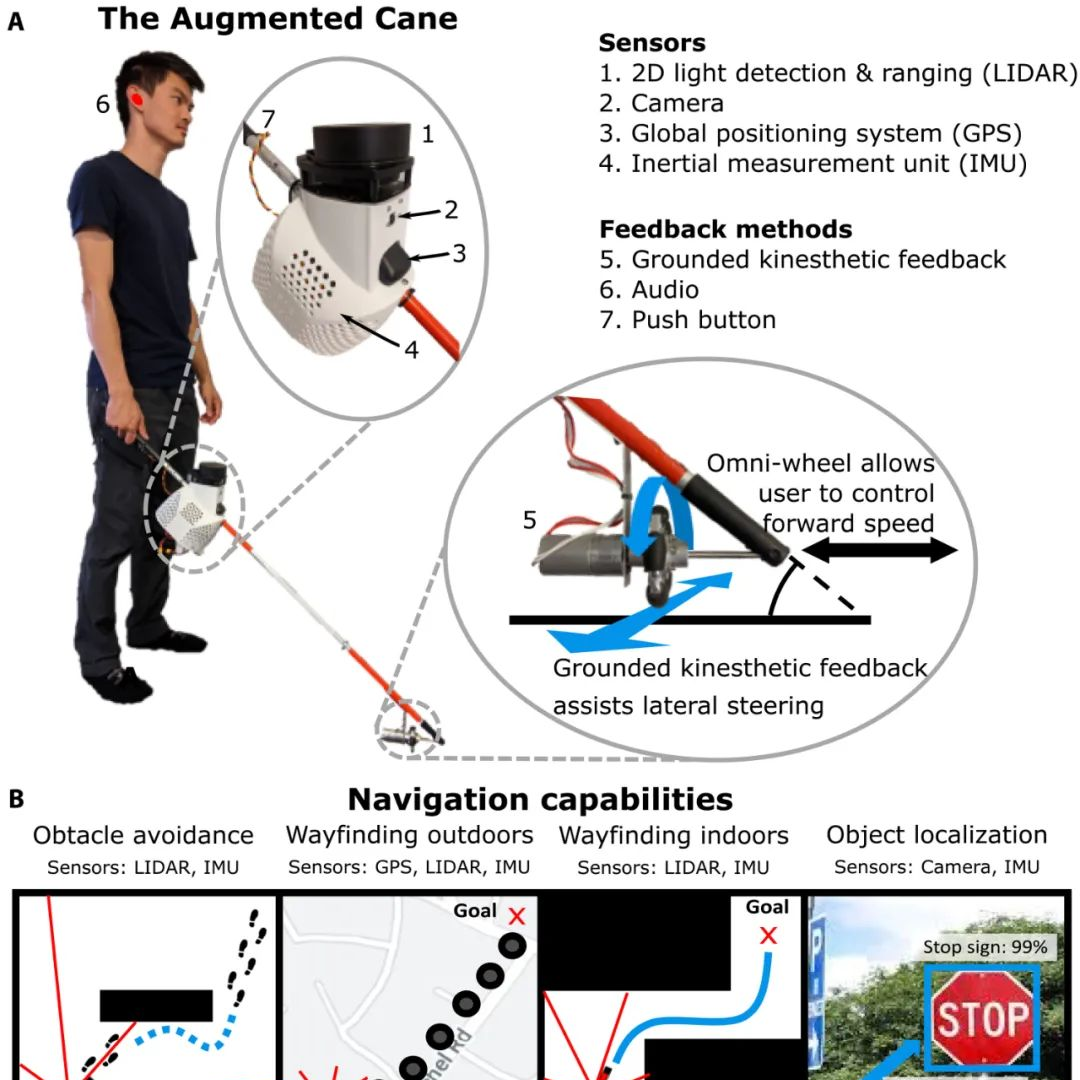 除此之外,斯坦福大學智能系統(tǒng)實驗室也研發(fā)出了一款智能導盲手杖。該手杖搭載了激光雷達、GPS,可根據(jù)目的地進行實時導航,也可為視障人群進行障礙探測并規(guī)劃路線。