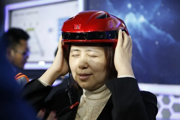 來自江蘇的郭萍在年輕時因患視網(wǎng)膜色素變異而導致雙眼失明。如今,她戴著智能助盲帽,在志愿者的陪同下,對智能助盲帽進行了體驗。郭萍表示,在穿戴上助盲帽時,她的世界又“亮”了起來,周圍的環(huán)境也都轉(zhuǎn)變?yōu)榱苏Z音。