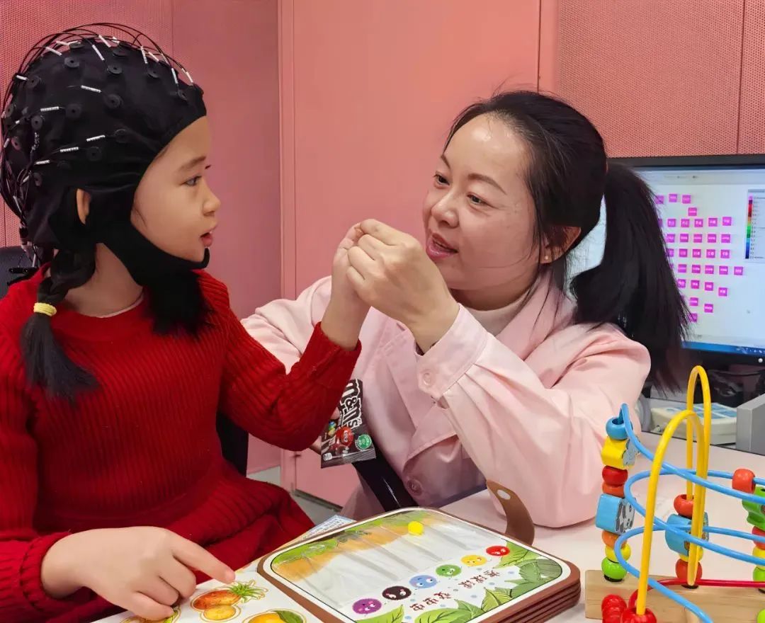 患有神經(jīng)性耳聾的3歲女孩然然(化名)則在MMR(失匹配反應(yīng))精準言語聽覺訓練服務(wù)的幫助下,通過腦機設(shè)備和客觀評估檢測,提高了言語和聽覺感知能力。