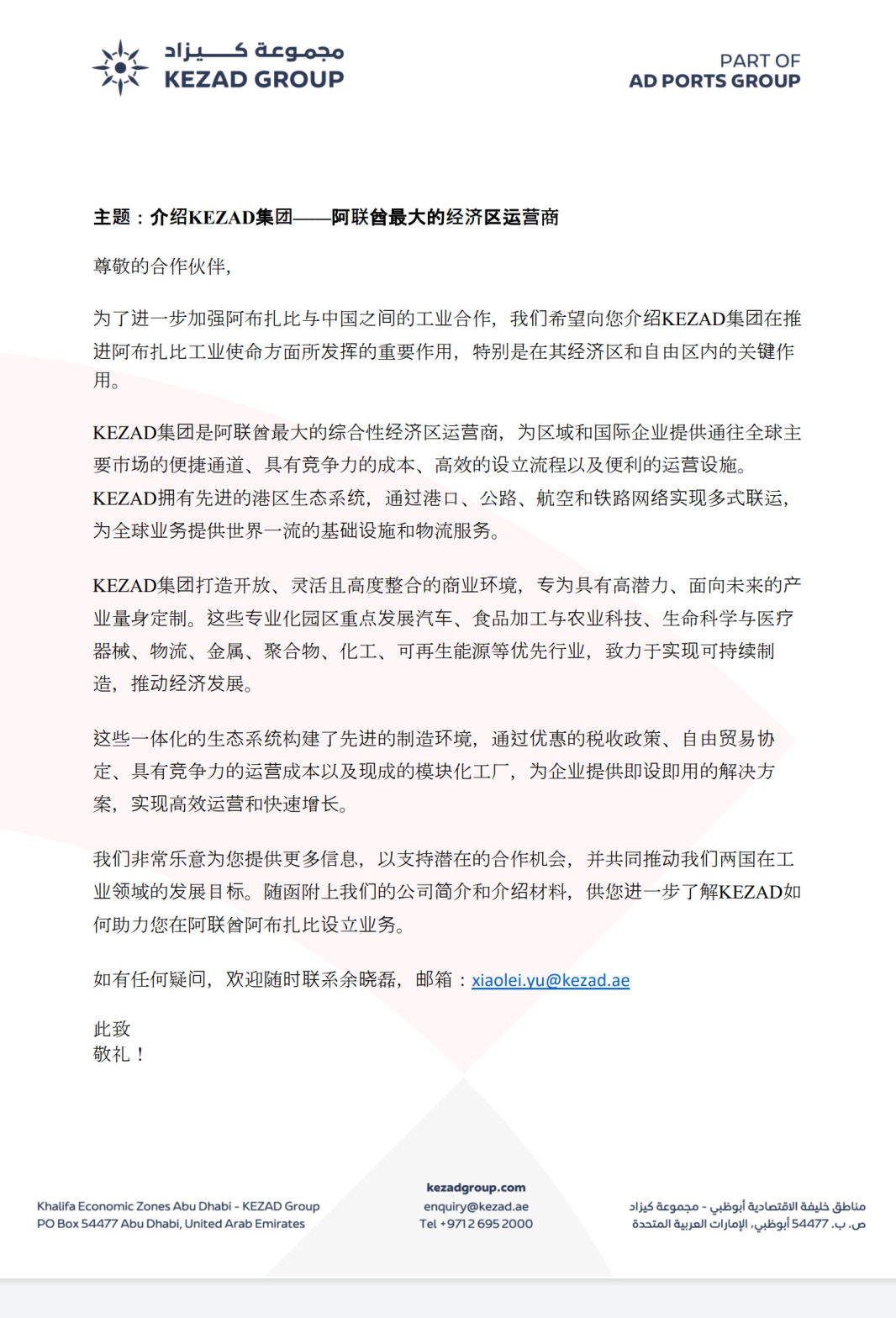 KEZAD集團(tuán)是阿聯(lián)酋最大的綜合性經(jīng)濟(jì)區(qū)運(yùn)營商,為區(qū)域和國際企業(yè)提供通往全球主要市場(chǎng)的便捷通道、具有競(jìng)爭(zhēng)力的成本、高效的設(shè)立流程以及便利的運(yùn)營設(shè)施。