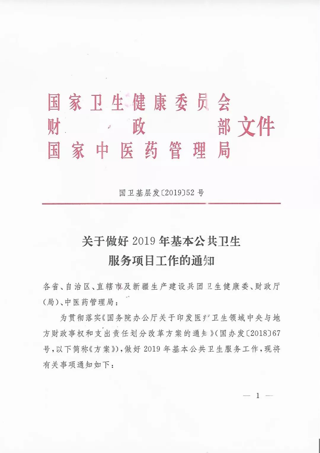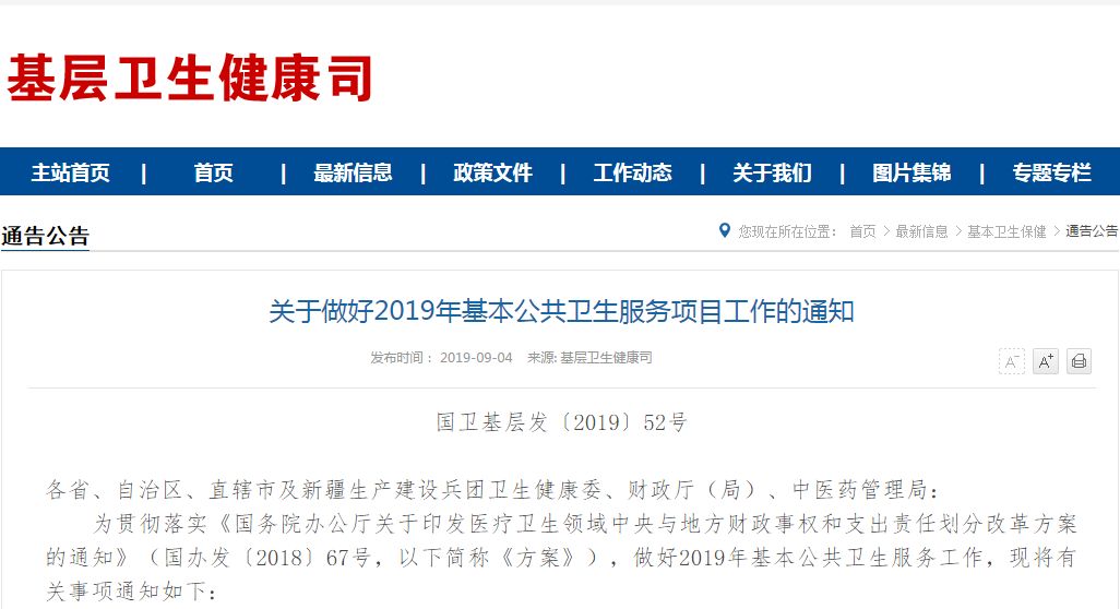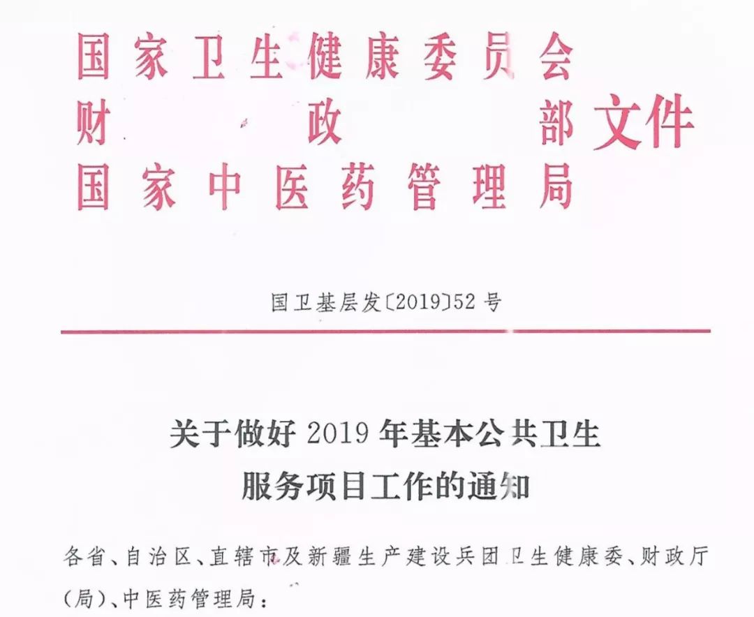 近日,國(guó)家衛(wèi)健委、財(cái)政部、國(guó)家中醫(yī)藥管理局聯(lián)合發(fā)布《關(guān)于做好2019年基本公共衛(wèi)生服務(wù)項(xiàng)目工作的通知》(以下簡(jiǎn)稱《通知》)。