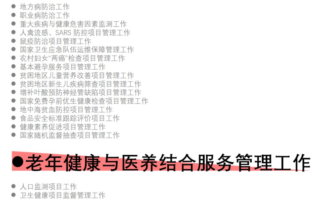 2019年起將原重大公共衛(wèi)生服務(wù)和計(jì)劃生育項(xiàng)目中的婦幼衛(wèi)生、 老年健康服務(wù) 、 醫(yī)養(yǎng)結(jié)合 、衛(wèi)生應(yīng)急、孕前檢查等內(nèi)容納入基本公共衛(wèi)生服務(wù)。