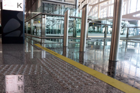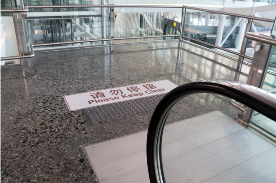 除入樓后有引導至綜合問詢柜臺的連續(xù)行進盲道,在航站樓內(nèi)部的其他區(qū)域也設置了不連續(xù)的提示盲道,在盲道途中由服務人員協(xié)助通行,體現(xiàn)機場的人性化服務。