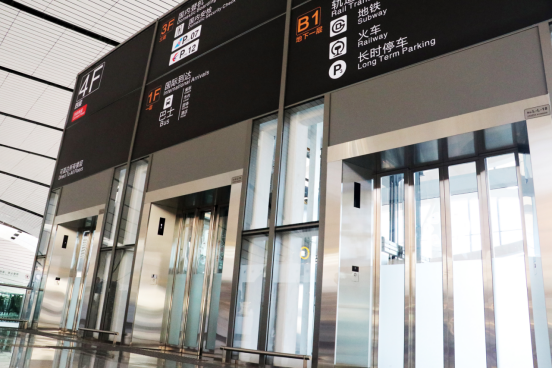 航站樓內(nèi)的旅客電梯入口均采用八字形入口,門寬不小于1.2米,在避免旅客磕碰的同時,方便輪椅的進出。電梯入口位置距離電梯門300mm位置也設有提示盲道。