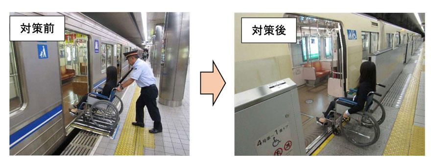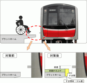 縫隙的應(yīng)對措施:在站臺前端設(shè)置梳狀縫隙填充材料(橡膠制),以保證在電車與站臺不接觸的情況下將縫隙縮短至最小限度(20~30毫米)。