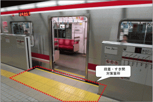 為防止乘客墜落至軌道中,特在尚未安裝可動式站臺護(hù)欄與站臺門的線路中,為其車輛連接部設(shè)置了護(hù)欄。
