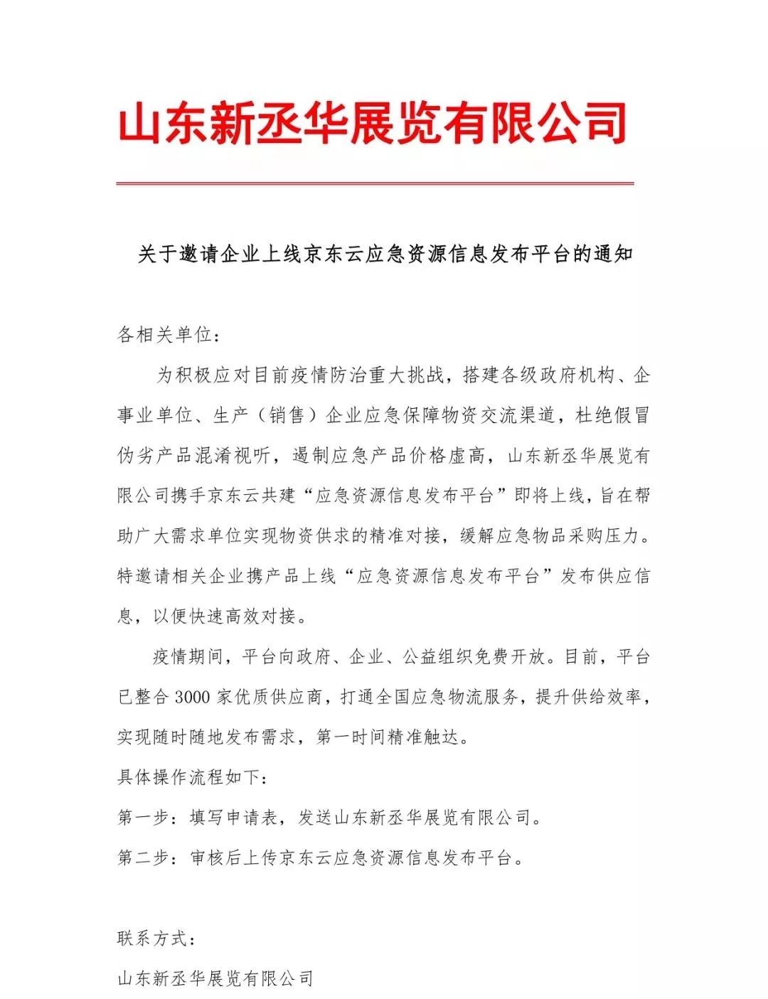 近日,疫情肆虐,多地應(yīng)急物資紛紛告急。為幫助各級(jí)政府 部門、醫(yī)療機(jī)構(gòu)實(shí)現(xiàn)物資供求信息的精準(zhǔn)對(duì)接,緩解疫情壓力,由京東團(tuán)隊(duì)研發(fā)“應(yīng)急資源信息發(fā)布平臺(tái)”及“智能情感客服”,山東新丞華展覽有限公司負(fù)責(zé)面向全國(guó)醫(yī)療衛(wèi)生機(jī)構(gòu)推廣,強(qiáng)強(qiáng)聯(lián)合,攜手打贏疫情阻擊戰(zhàn)。