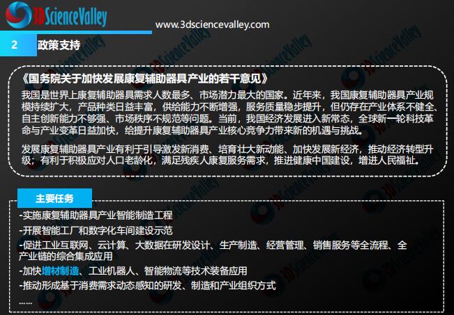 隨著市場對醫(yī)療器具的需求不斷攀升,3D打印以其“增材制造”的優(yōu)勢,在醫(yī)療器具的研發(fā)生產(chǎn)上贏得了國家在政策上的支持:在2018年國家康復(fù)輔具研究中心牽頭申報的“仿生假肢手感知與控制的神經(jīng)信息解析和交互技術(shù)研究”以及“假肢矯形器的個性化設(shè)計與增材制造應(yīng)用示范”兩項項目均獲批立項,中央財政資助經(jīng)費分別為2380萬元和931萬元。