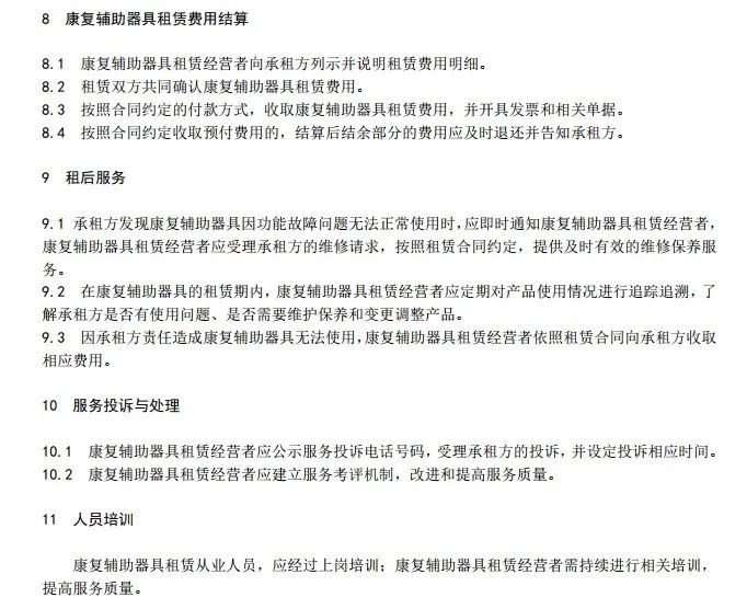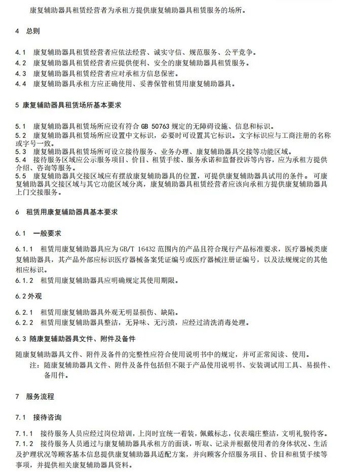 該意見稿從租賃場所、租賃用康復輔具、服務流程、租賃費用結算、租后服務、投訴與處理、人員培訓等7個方面規(guī)定了康復輔具租賃服務的基本要求。
